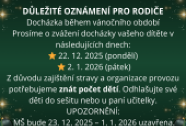 Od 1.10.2025 byla přiznána MŠ SNĚŽENKA dotace MSK na prominutí úplaty za školní stravování.Pokud…